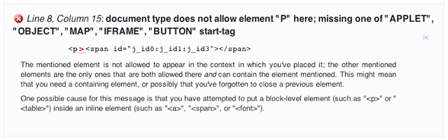 A block-level element, the <p></p> tags in this case, can not be contained in an inline element, and guess what? The <apex:outputPanel> by default is implemented via <span> tags, and a <span> is an inline element—mystery solved! Well, no, not really.