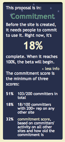 As the nice blue box explains, the 18% displayed at the top is the lowest of three different scores, which are listed at the bottom. Rather than delve into the details of commitment score (which we don't really need to be concerned with right now), or worry about the top score (51%, which is pretty straightforward and progressing nicely as word gets around — keep spreading it!), I want to focus on the middle score. The 18%. As commitment scores go, this is the big one, not in terms of numerical magnitude, but what it represents. As you can see we need 100 committers with a reputation score equal to, or greater than, 200 on other sites in the network, , i.e. on Stack Exchange sites other than the Area 51 site which is where proposals for new sites (such as ours) germinate. Reputation is earned through the asking, and answering, of good, valuable questions, and can also be gained through effective and helpful moderation—initially your moderation and editing capabilities are severely restricted (limited to flagging and peer-reviewed edits), but the more your prove yourself to be a valuable community member, the more reputation you earn, and the more tools you are granted access to.