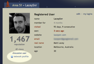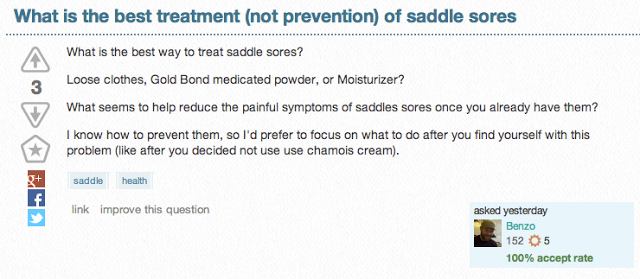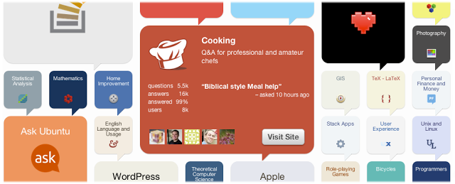 So let's say that you've either committed to the Salesforce proposal (or you're going to right now), but you don't yet have an account on another of the network sites and would like to help further our progress by building up some reputation elsewhere. As luck would have it (or some careful thought and consideration by the Stack Exchange team) there is a nice page showing all of the sites currently available, a screenshot of which is shown above with the Cooking site highlighted. Whoever you are, and whatever you do for a living, there is likely to be at least one site which piques your interest. You may for instance be an avid cyclist, and could help Benzo treat his saddle sores.