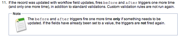 One of my colleagues encountered a tricky problem where his validation rule seemed to work perfectly when updating a record, but not when creating a record. As it turned out, the snag was that his validation rule made use of the CreatedDate field, and custom validation rules are applied in step 4 of the data modification process right before the record is first saved to the database; the upshot being that once again, CreatedDate has a value of null!